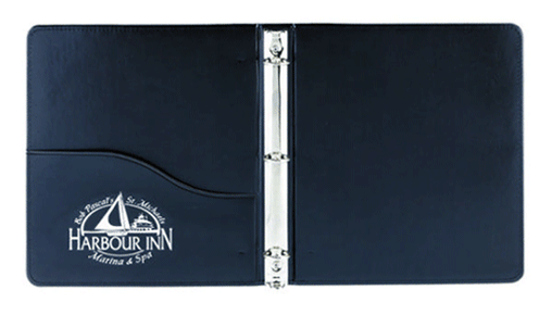 Choose from D-ring binders, leather 3 ring binders or vinyl ring binder covers. D ring binders can hold a larger capacity of your loose leaf papers. Three ring binders with a variety of metal ring sizes available. Vinyl and leather ring binders personalized to promote your business or nonprofit organization. Have your text, business name or organizations logo added to the front cover.